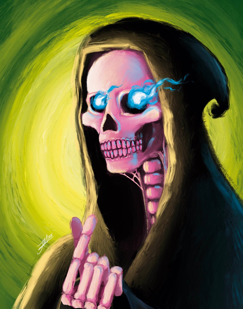 Step into the afterlife with Skeleboy, a vivid and rebellious reimagining of the Grim Reaper archetype. Cloaked in shadow and radiating electric energy, this skeletal figure blazes with rizz—glowing blue eyes ablaze and fingers raised in a defiant gesture of undead love..